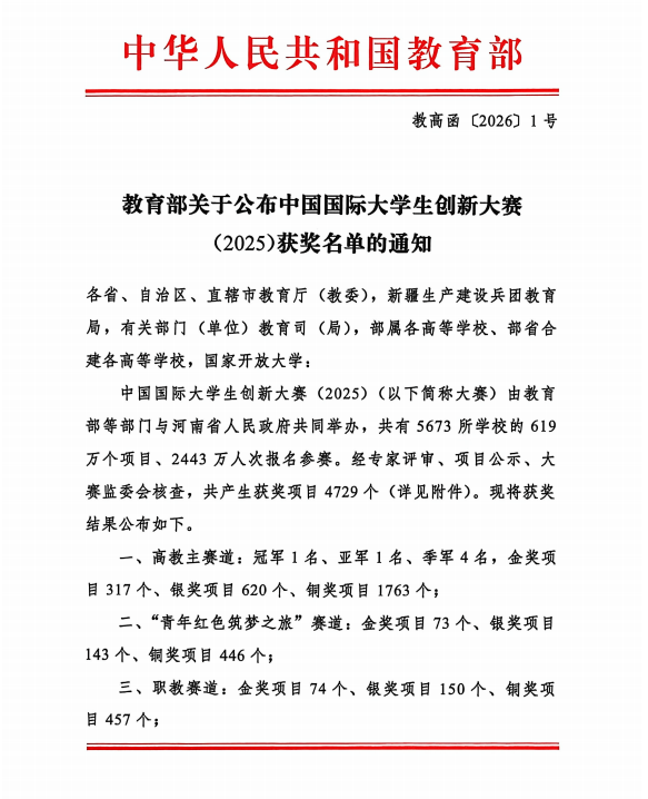 下一步,学校将以此次获奖为契机,总结经验、再接再厉,持续深化创新创业教育改革,不断完善双创育人体系,进一步激发全校师生的创新创造活力,引导广大青年学子将个人成长融入国家发展大局,在创新创业的浪潮中锤炼本领、成就自我,为中国式现代化建设贡献力量。
